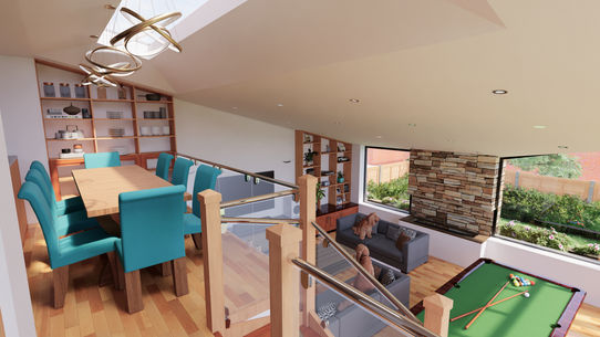 An extension to an ex-council house to connect the ground floor to the lower garden to the back and side. The design features a 1.5 storey living space with a removable dining mezzanine. The existing kitchen at the rear of the house is enlarged and opened up into the new space to gain natural light, and commanding views over the living space and out to the garden. The garden is landscaped around a patio with BBQ, with built up stone flowerbeds and outside cooking area. This is connected back to the extension with a large bi-folding door and level sill to allow easy movement from inside to outside, and feature glazing in both directions and a skylight.